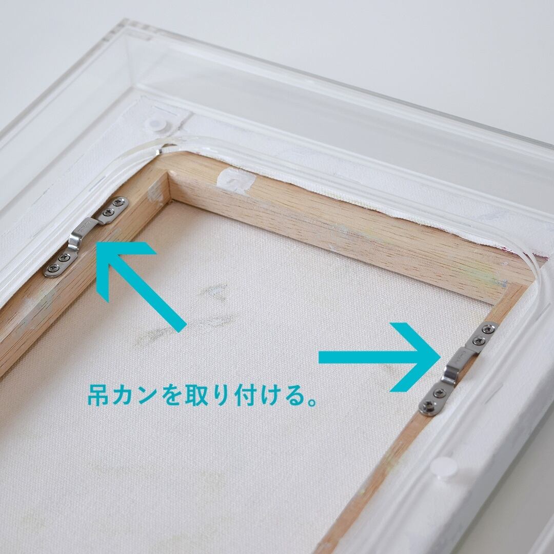 市販されている木製パネルは木枠幅(14mm~20mm程)が細いため、吊りカンを取り付けて紐で額を吊り下げると、吊カンに額も含めた総重量がかかり、吊カンが内側に引っ張られて木枠が破損する恐れがあります。