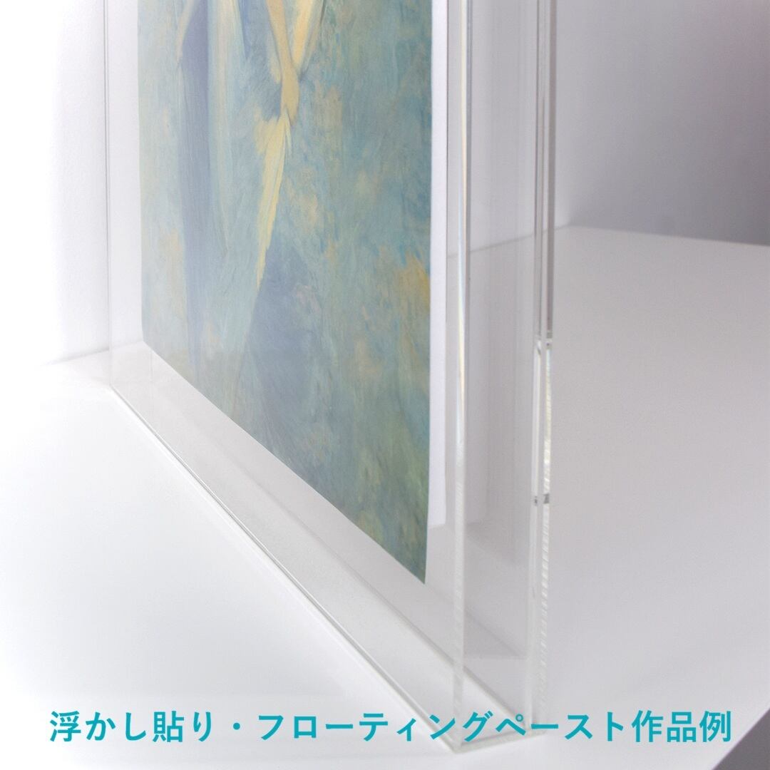 ◇アクリル製の透明な額 prèdoux®は、キャンバス木枠の作品、木製パネルの作品、写真、ポスター、版画などの薄い作品の浮かし貼りなどに使用できます。