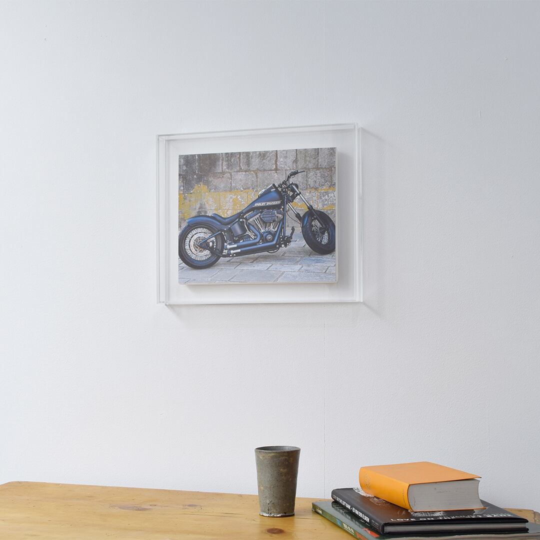 ◇アクリル製の透明な額 prèdoux®は、キャンバス木枠の作品、木製パネルの作品、写真、ポスター、版画などの薄い作品の浮かし貼りなどに使用できます。